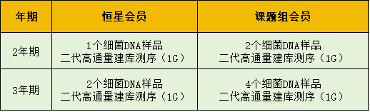 升级会员为恒星会员或课题组会员,并选择2年期、3年期,可获赠免费高通量测序资格。具体规则如下。