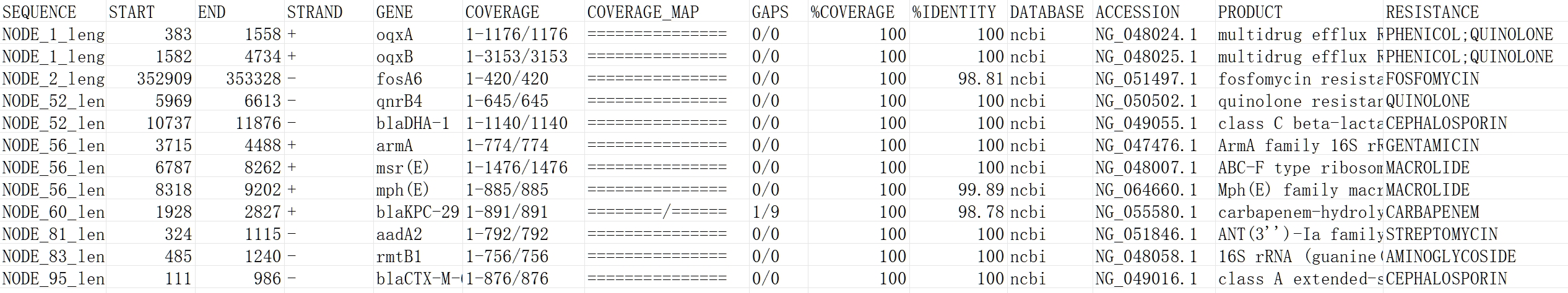 SEQUENCE:序列名称;START:匹配区域在序列上的起始位置;END:匹配区域在序列上的终止位置;STRAND:匹配区域所在的链,"+"表示正链,"-"表示负链;GENE:基因/质粒分型基因;COVERAGE:匹配的碱基范围及总长度,格式为“起止-终止/总长”,如1-251/251表示全长覆盖;COVERAGE_MAP:匹配覆盖的可视化表示,"="表示覆盖,"/"表示缺口;GAPS:匹配中的缺口数,格式为“实际缺口数/允许缺口数”;%COVERAGE:匹配区域占参考基因的百分比,100表示全长覆盖;%IDENTITY:匹配区域与参考基因的相似性百分比;DATABASE:匹配所用的数据库名称,如ncbi(基于NCBI的耐药数据库),plasmidfinder(质粒分型数据库);ACCESSION:参考基因在数据库中的登录号(Accession Number);PRODUCT:匹配到的基因或产物的详细名称;RESISTANCE:相关的耐药性信息