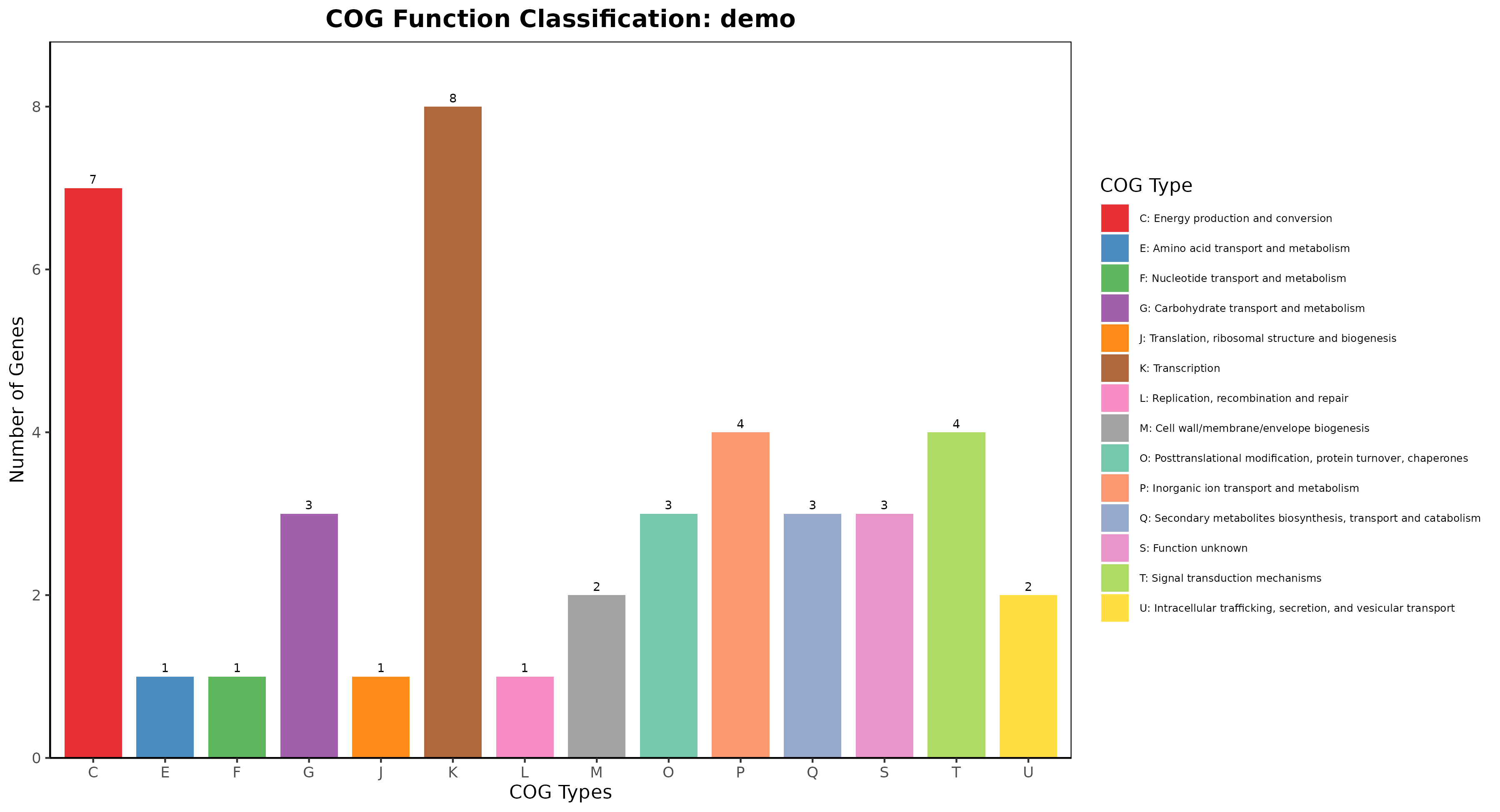 本工具基于蛋白质序列文件,与eggNOG数据库进行比对,并获取细菌、真菌、质粒、病毒、支原体等类型样本基因组COG分类注释信息和统计信息,并可视化作图展示。