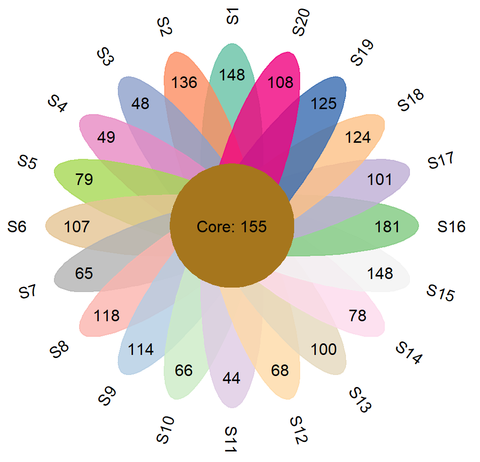 花瓣图(Flower plot),是一种用于展示多个集合之间的共有和特有特征数量分布的图形,与常规韦恩图相比,可以展示更多的集合间的特征分布状况,但只能展示所有样本的共有特征和特有特征数量,无法给出某几个集合间的共有特征数量。