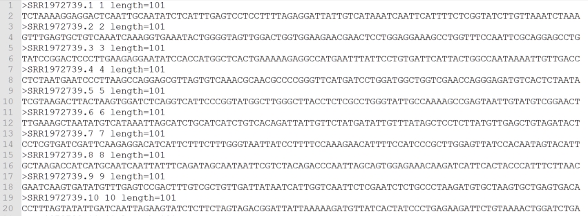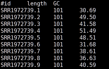 分析时,选择指定文件,工具即可对该文件中的每一条序列进行统计,输出序列ID,序列长度和GC含量。